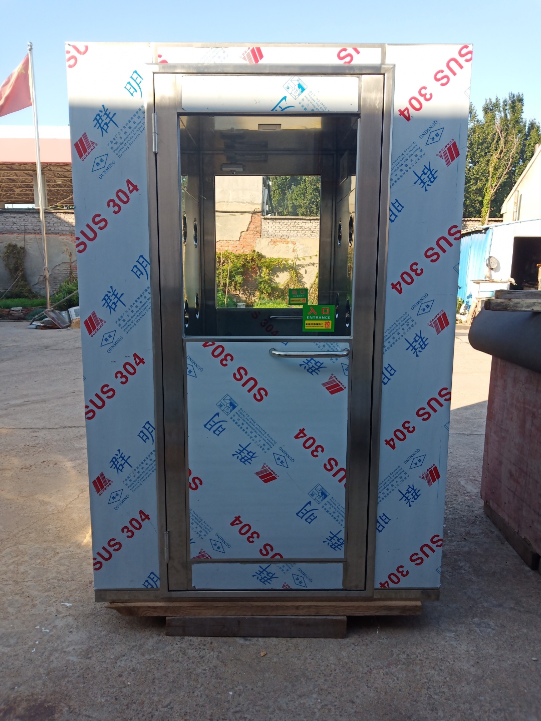 (3)拉開不銹鋼風(fēng)淋門人員進(jìn)入風(fēng)淋室后,風(fēng)淋門立即自動(dòng)關(guān)閉外門,紅外線(聲控/人體熱能)感應(yīng),風(fēng)淋自動(dòng)啟動(dòng),吹淋15秒(出廠已設(shè)置)。注意:風(fēng)淋室在吹淋時(shí)兩個(gè)不銹鋼門不能同時(shí)打開,如強(qiáng)行打開將損壞電子鎖,風(fēng)淋室兩門是電子互鎖控制。
